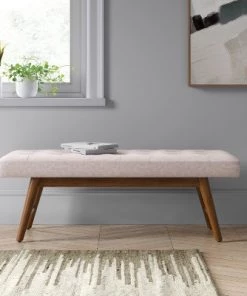 Add warm, welcoming vibes to your entryway or living room with the Copan Mid-Century Bench from Project 62™. This charming upholstered bench features a pretty padded seat with attractive button-tufted detail, resting on a rubberwood frame with slightly flared legs for an attractive modern shape. Great for placing in your entryway and topping with a decorative throw or pillow, it can be used as a place to rest as you slip your shoes on and off while also adding a beautiful decorative accent to your home.