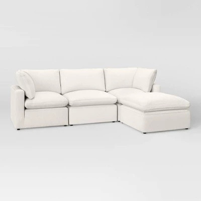 Accent your living space with the comfy and modern style of this 4-Piece Allandale Modular Sectional Sofa Set from Project 62™. This sectional sofa set includes two corner sectional pieces, one armless sectional piece and one ottoman, allowing you to assemble a perfect spot for enjoying a refreshing drink and chatting with friends or curling up with a good book. Draped in soft upholstery, this modular sectional sofa set in a solid hue easily mixes in with a range of decor styles and color palettes in your home. Simply add a coffee table or end tables alongside the sectional sofa set to create a warm, cozy feel.